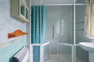 Shower room: Shower room with WHB, WC and shower cubicle. Wet wall in shower area, half height tiling on walls.